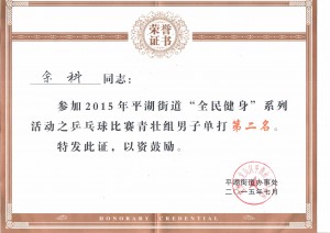 我司市場部員工余科先生參加由深圳市政府號召、各街道辦舉辦的體育賽事——乒乓球比賽中繼去年獲獎后,今年再次斬獲亞軍!